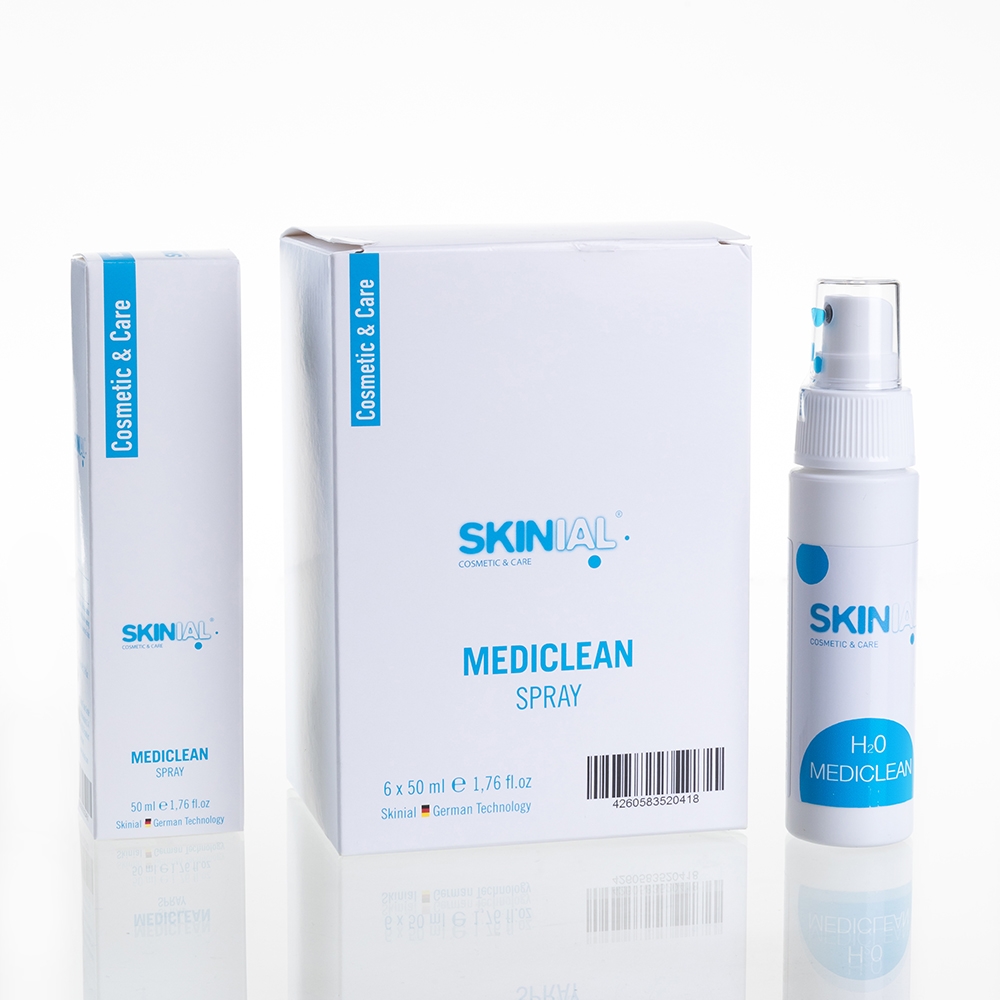 H2O Mediclean ist ein neuartiges, in der Kosmetik einzigartiges Spray zur Hauthygiene (Medizinprodukt). Es vermindert Krankheitserreger, vermehrungsf?hige Mikroorganismen (inkl. Viren und Bakterien). Bei der Anwendung werden die Enzyme in der Haut nicht zerst?rt (nicht zytotoxisch) wie das bei vielen anderen Desinfektionsmitteln der Fall ist, damit kann der Wundschluss und damit die Heilung viel schneller erfolgen! Das k?nnen Sie sogar beobachten.